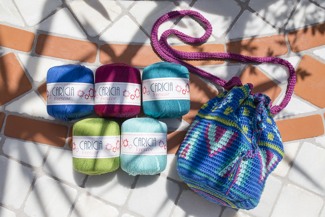 - Cadeneta de 70 cm. con varios tonos ya utilizados para hacer la tira con la que cerraos el bolso, ya terminada la pasamos por debajo del punto abanico.