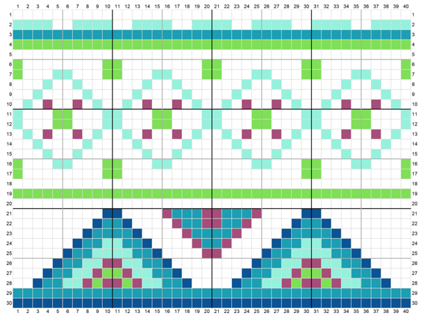 - Luego de hacer la última, en 4 pb. levanta cadeneta de 3 pt. y repites la secuencia, en tono azul aguamarina (505).