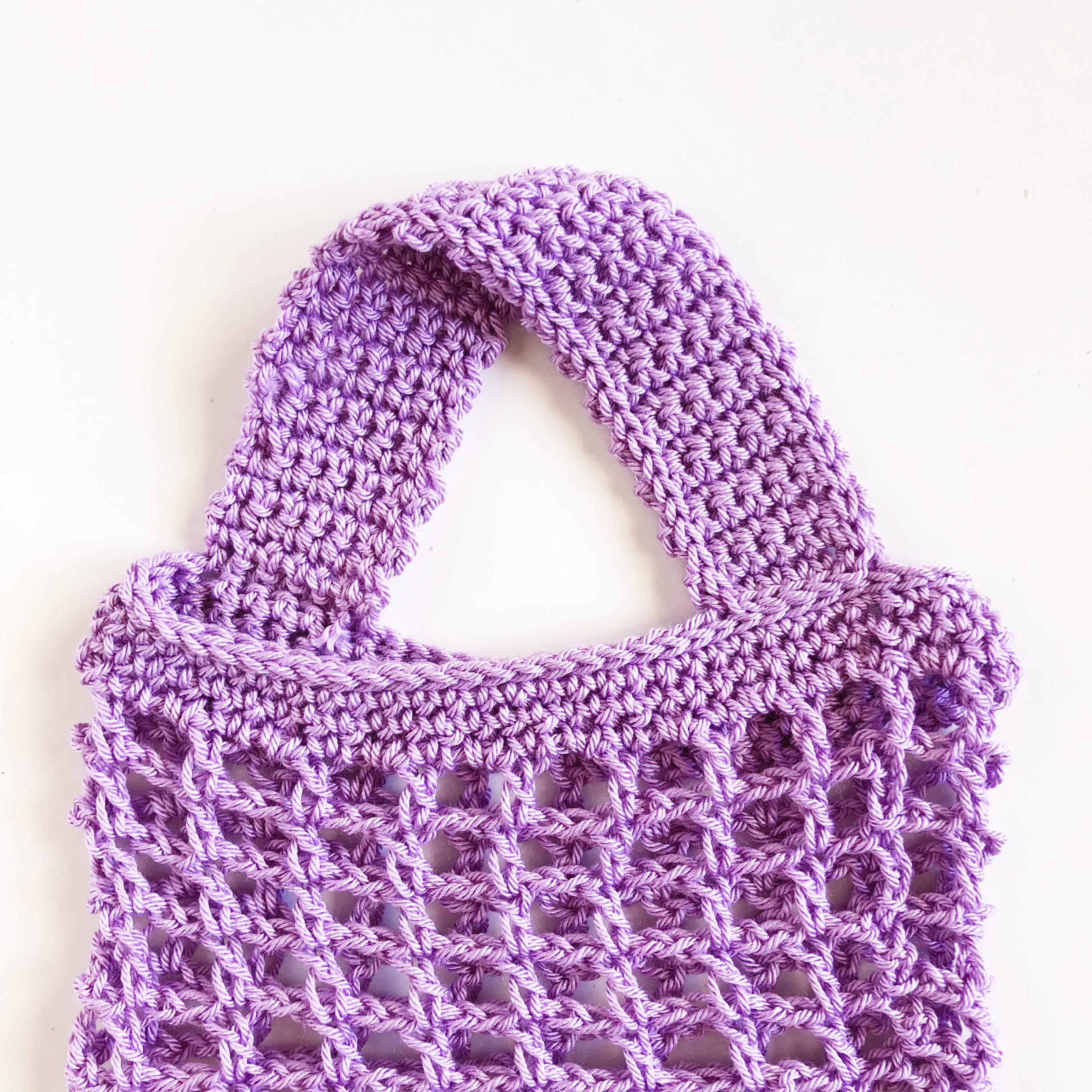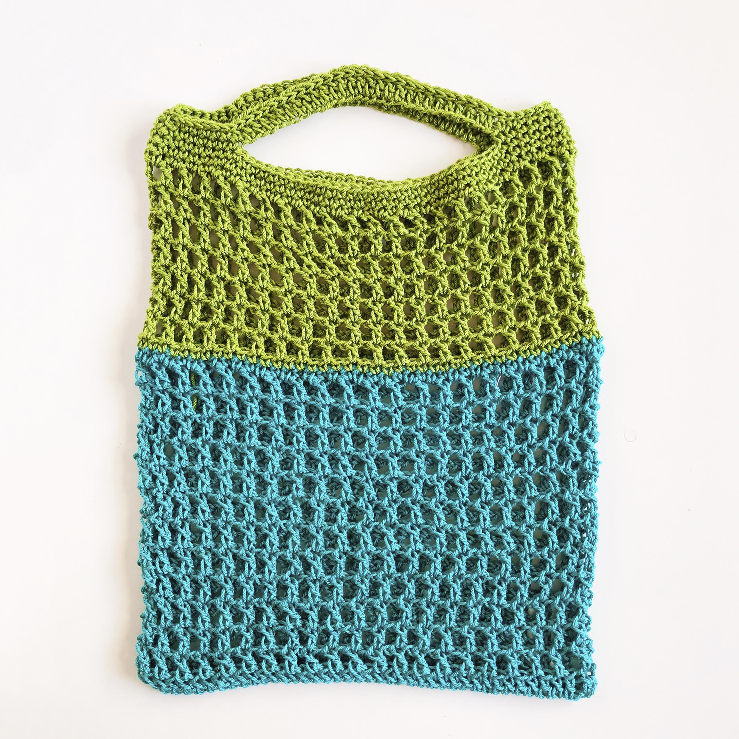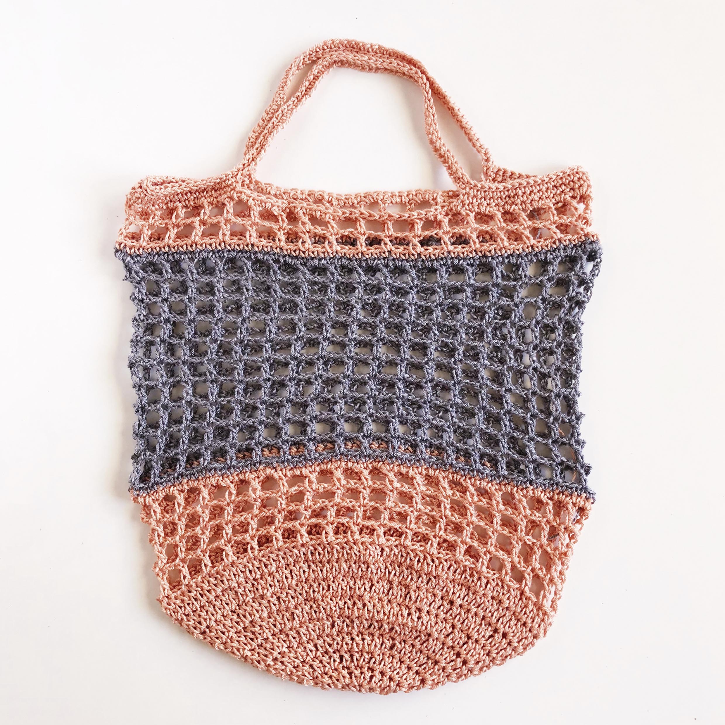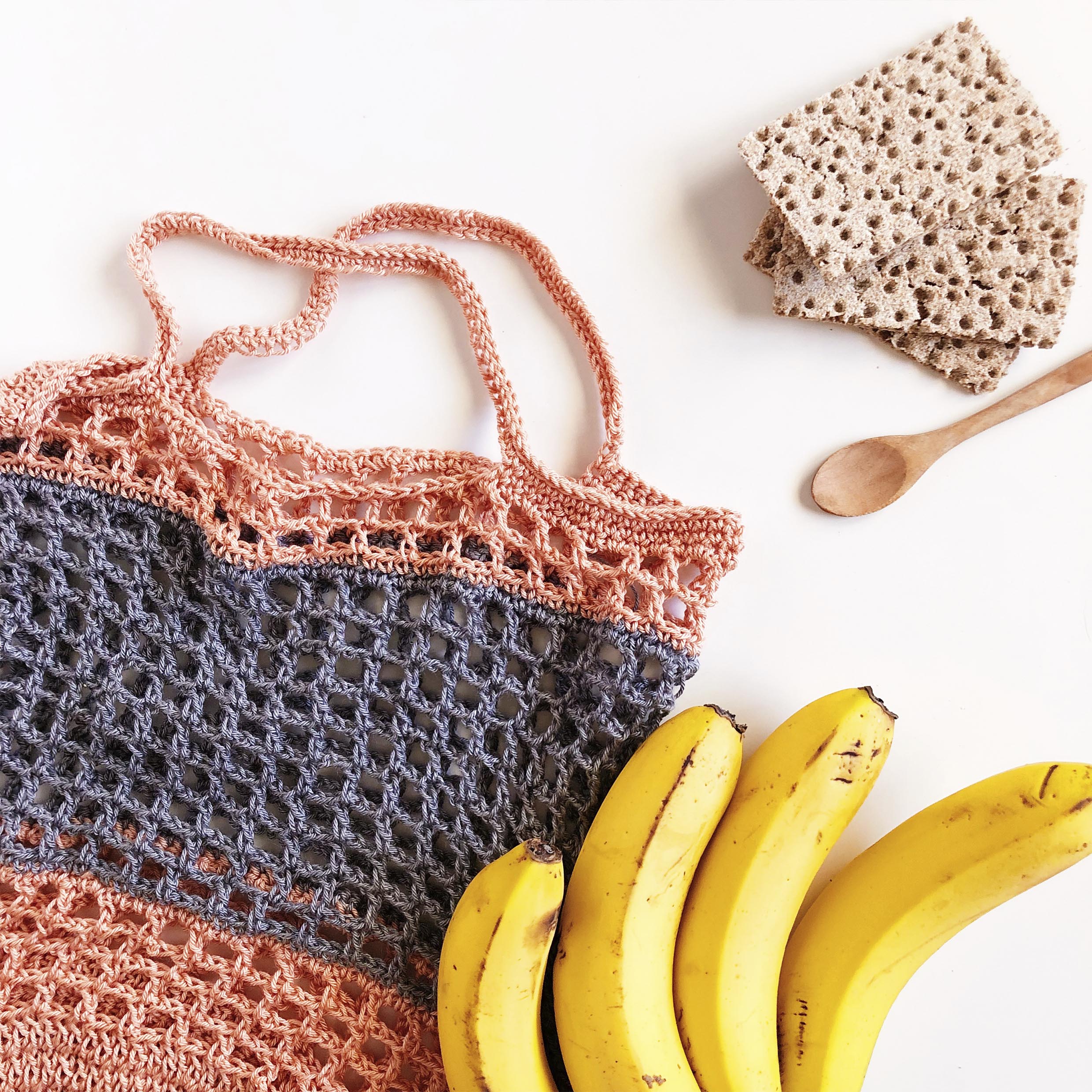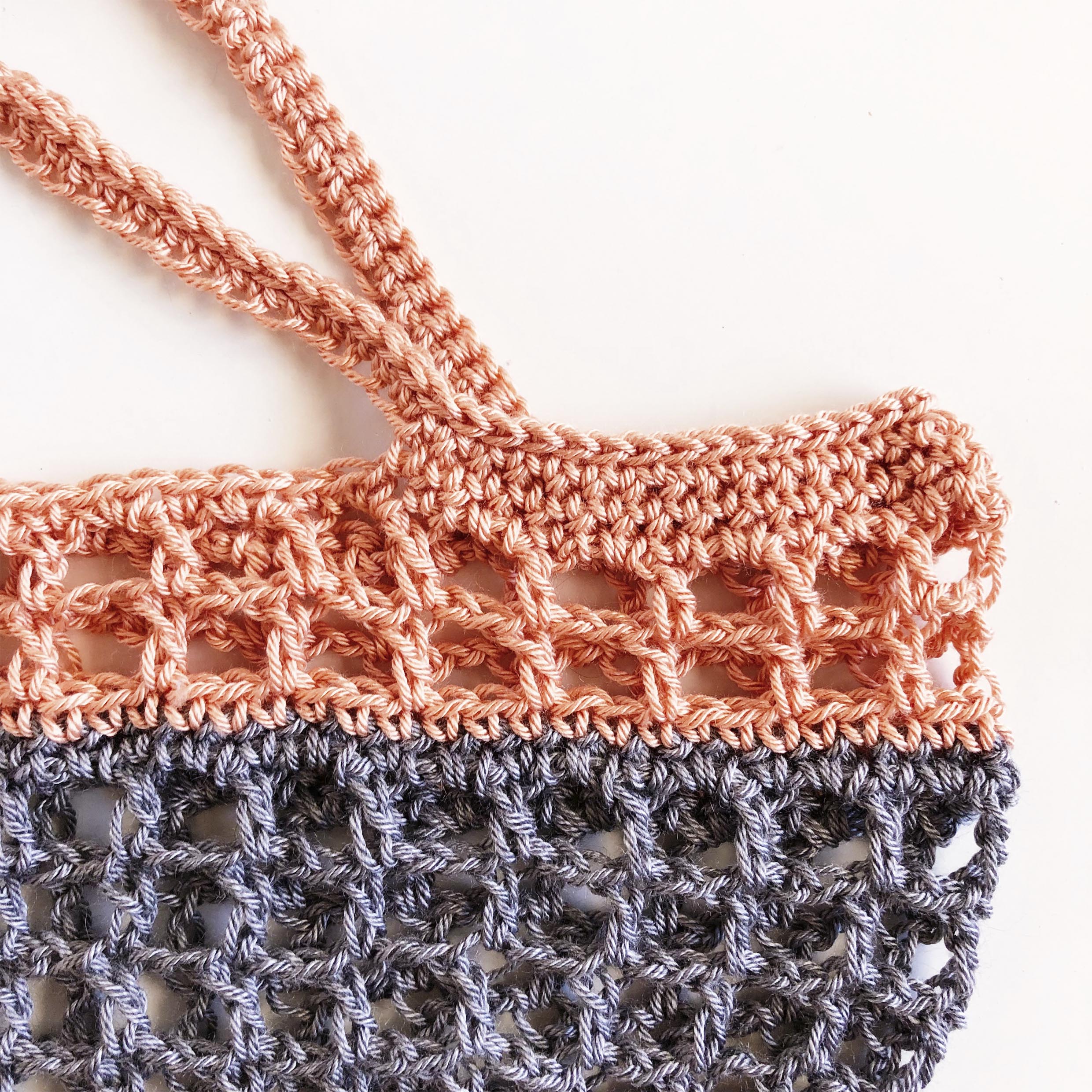 *color 1* - Empezamos haciendo 30ca como base para la labor. Rodeamos todas esas cadenetas por cada lado haciendo pa, con un total de 60pa. - Comenzamos la primera vuelta con 5ca, que equivalen a 1pa y 2ca, y saltando dos pa abajo, hacemos otro pa y otra dos ca. Este es el patrón que vamos a seguir durante 10 vueltas “1pa - 2ca (saltando 2p abajo)” - Toda la vuelta haciendo pb, uno en el punto alto y otro dos en el espacio de dos cadenetas (60p). *color 2* - Toda la vuelta haciendo pb (60p). - Repetimos la serie de “1pa - 2ca (saltando 2p abajo)” a lo largo de 14 vueltas más. - Hacemos 3 vueltas completas de pb (60p cada una). - Asas: 6pb como base del asa y vamos haciendo hileras de 6pb, girando la labor, durante 35 vueltas. - Saltamos 24pa en el borde de la bolsa y unimos la última hilera del asa con 6pc. - Para rematar, hacemos una vuelta de pc en el borde del bolso y una hilera de pc a cada lado del asa. Cortamos y escondemos hebras. - Opcional: hacer una bolsita de tela para la base, que servirá como recogemigas.