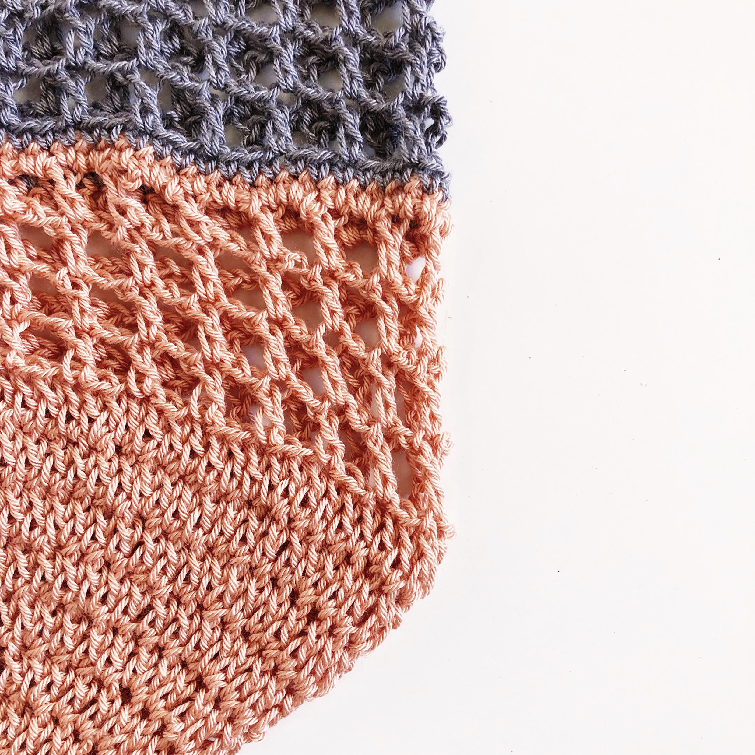 *color 1* - Empezamos haciendo 42ca como base para la labor. Rodeamos todas esas cadenetas por cada lado haciendo pa, con un total de 84. - Comenzamos la primera vuelta con 4ca, que equivalen a 1pa y 1ca, y saltando un pa abajo, hacemos otro pa y otra ca. Este es el patrón que vamos a seguir durante 12 vueltas “1pa - 1ca (saltando 1p abajo)” - Toda la vuelta haciendo pb, uno en el punto alto y otro en el espacio de una cadeneta (84p). *color 2* - Toda la vuelta haciendo pb (84p). - Repetimos la serie de “1pa - 1ca (saltando 1p abajo)” a lo largo de 7 vueltas más. - Hacemos 3 vueltas completas de pb (84p cada una). - Asas: 7pb, 28ca, saltamos 28p de la vuelta anterior, 14pb, 28ca, saltamos 28p de la vuelta anterior, 7pb. - 6pb, 1pm, 28pa (en el espacio de cadenetas de la vuelta anterior), 1pm, 12pb, 1pm, 28pa (en el espacio de cadenetas de la vuelta anterior), 1pm, 6pb. - Para rematar hacemos una vuelta completa a todo el borde de pc. - Cortamos y escondemos hebras.