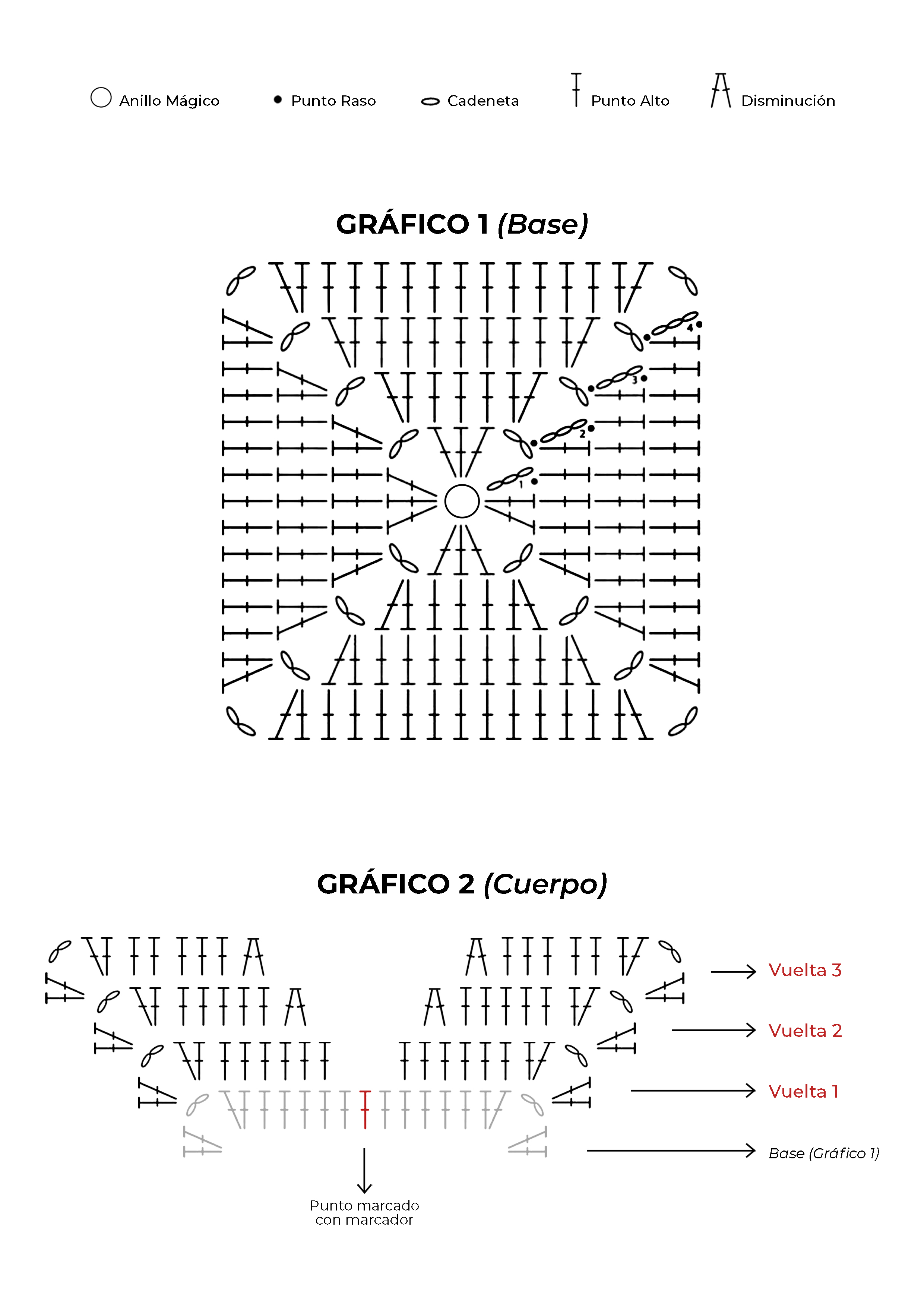 - Toda la labor son puntos altos y cadenetas, siguiendo los gráficos del patrón.
