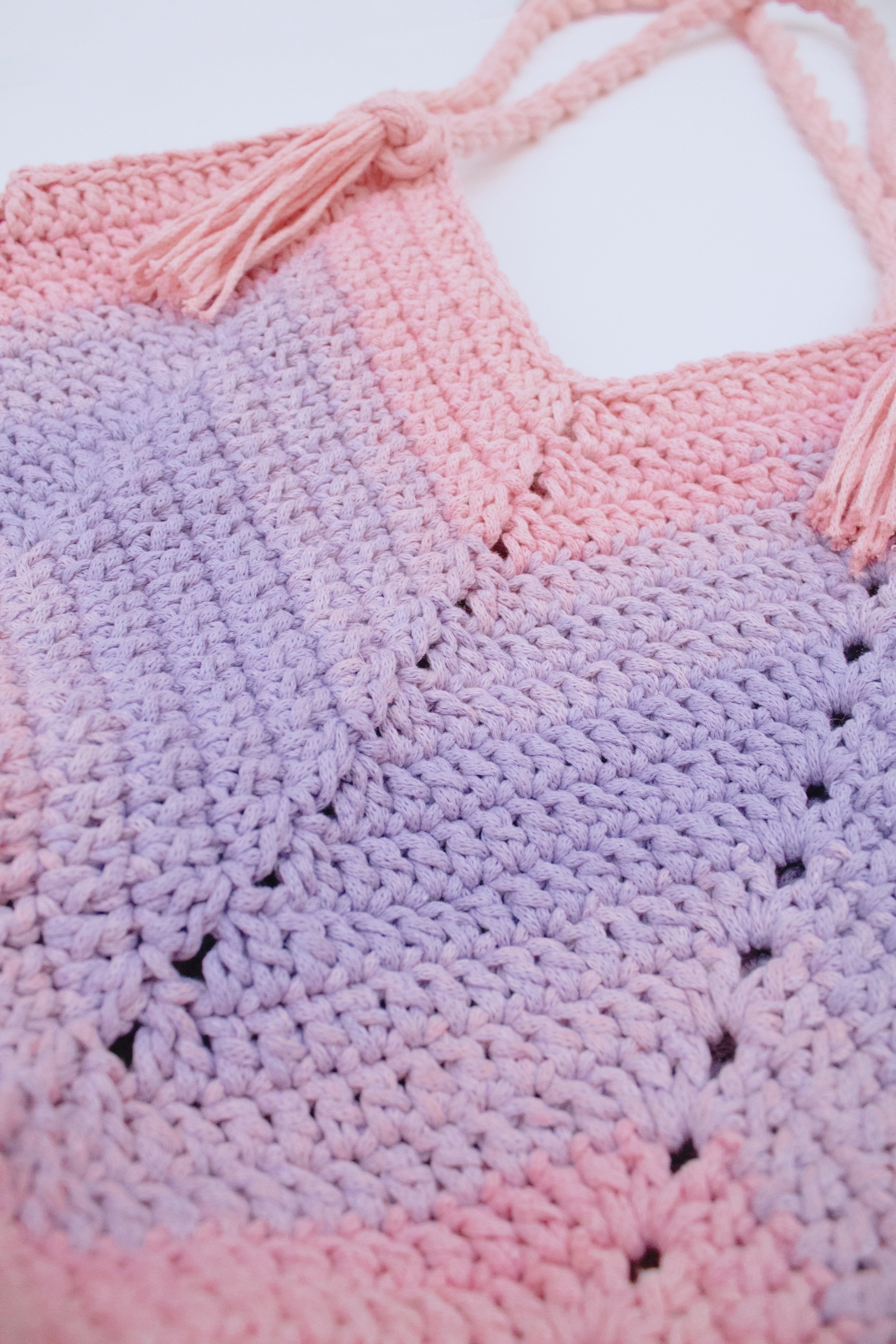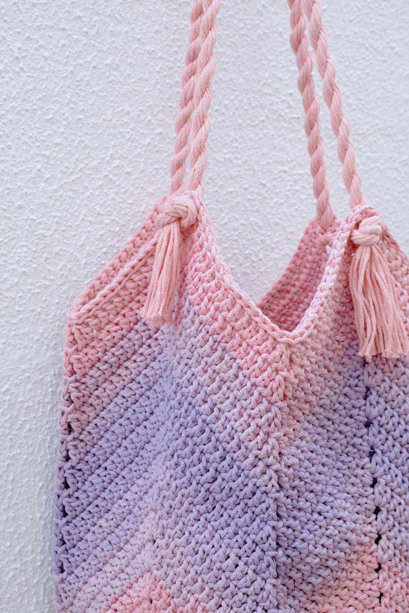 Para hacer el cordón tienes que cortar 10 cabos de hilo de 100cm y empezar a enrollarlos sobre sí mismos hacia un mismo lado. Cuando estén ya muy enrollados notarás como al doblarlos se empiezan a girar solos hacia el lado contrario del que estamos enrollando nosotros. Una vez llegas a este punto, coges el cordón por la mitad y le dejas girar sobre sí para que se vaya formando el cordón principal. Introduces cada uno de los laterales por los huecos que se formaron en los aumentos del cuerpo del bolso, anudas el lado que tiene los cabos sueltos y cortas y anudas el lado de la mitad del cordón. Repites este proceso para formar el otro asa y ¡listo!