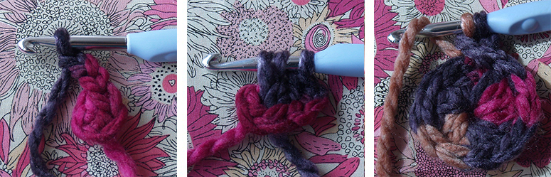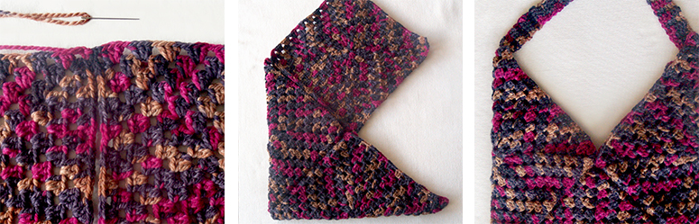 Para unir las rosetas, coser primero un cuadrado a otro por uno de sus laterales, y siempre por el derecho de la labor (ver tutorial: coser costuras). Coser la tercera roseta tal y como ves en la foto. Doblar cada roseta por la mitad y terminar de coser el lateral que falta.