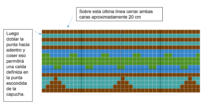 Para tejer esta bufanda comenzaremos con una línea base y luego nos guiaremos con el siguiente diagrama. Cadeneta de 190 pt. Tono (016) marrón pm. este tono marcara las líneas del diagrama. Seguir diagrama en pa. Total de líneas: 16