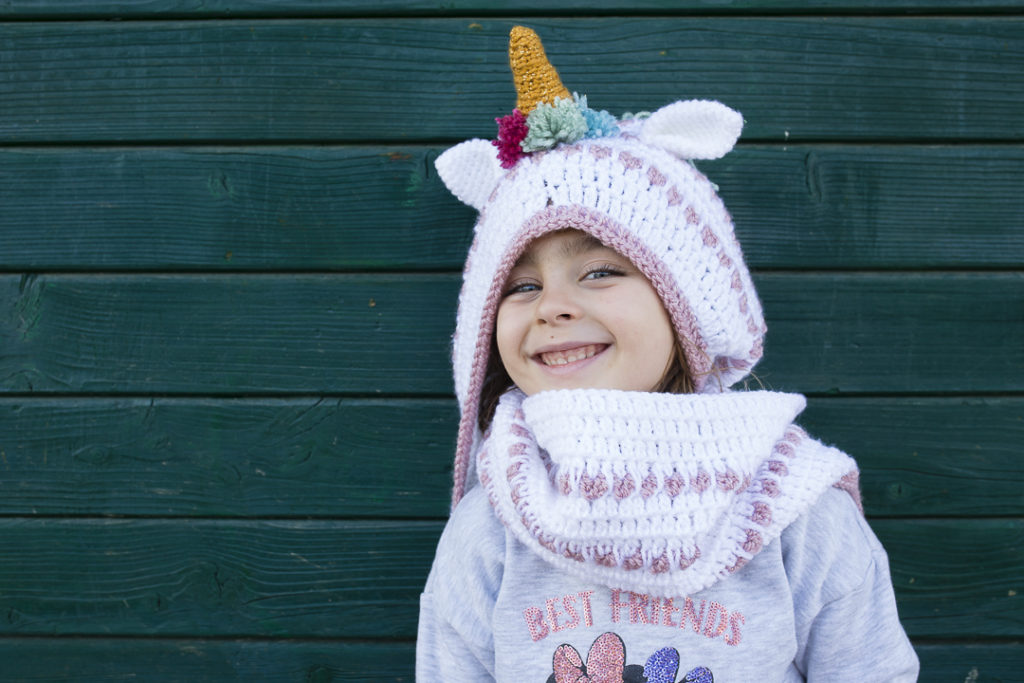 4 puntas en punto alto, unidas de manera individual en fila sobre la cabeza hacia el cierre de la capucha. Anillo mágico de 4 pa. Puntos altos, Aumt. Cada 4 pt. Coser y unir a la pieza.*BUFANDA NIÑA UNICORNIO