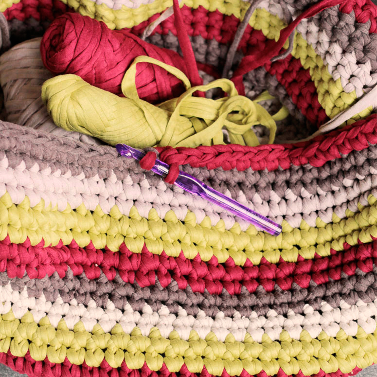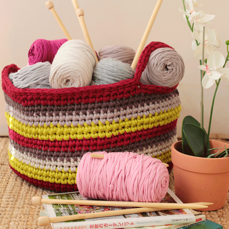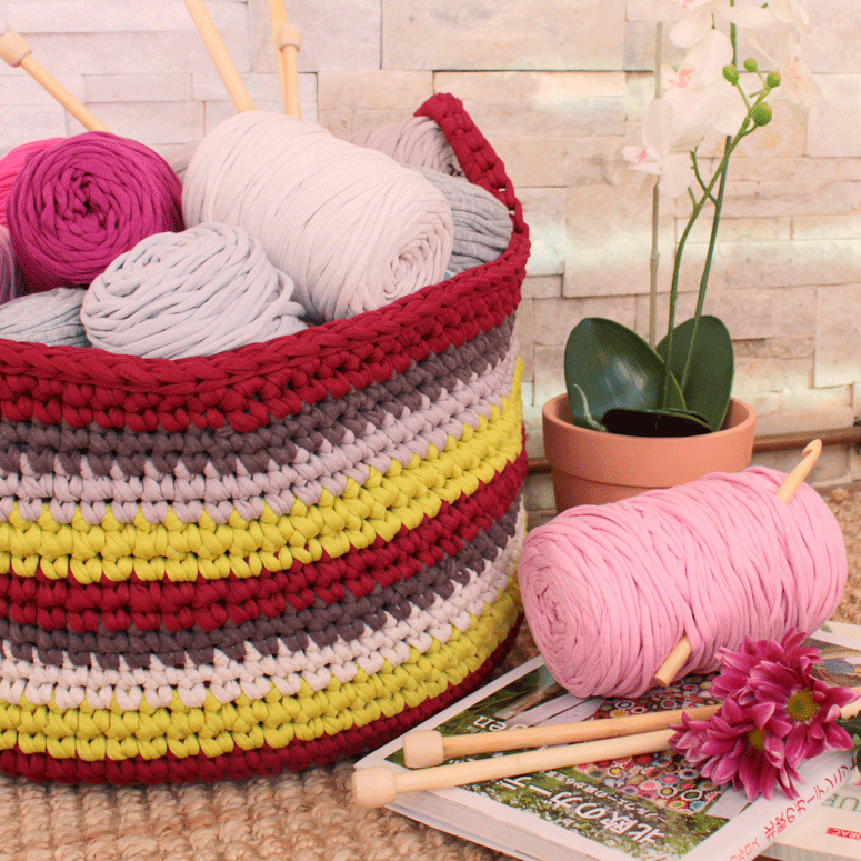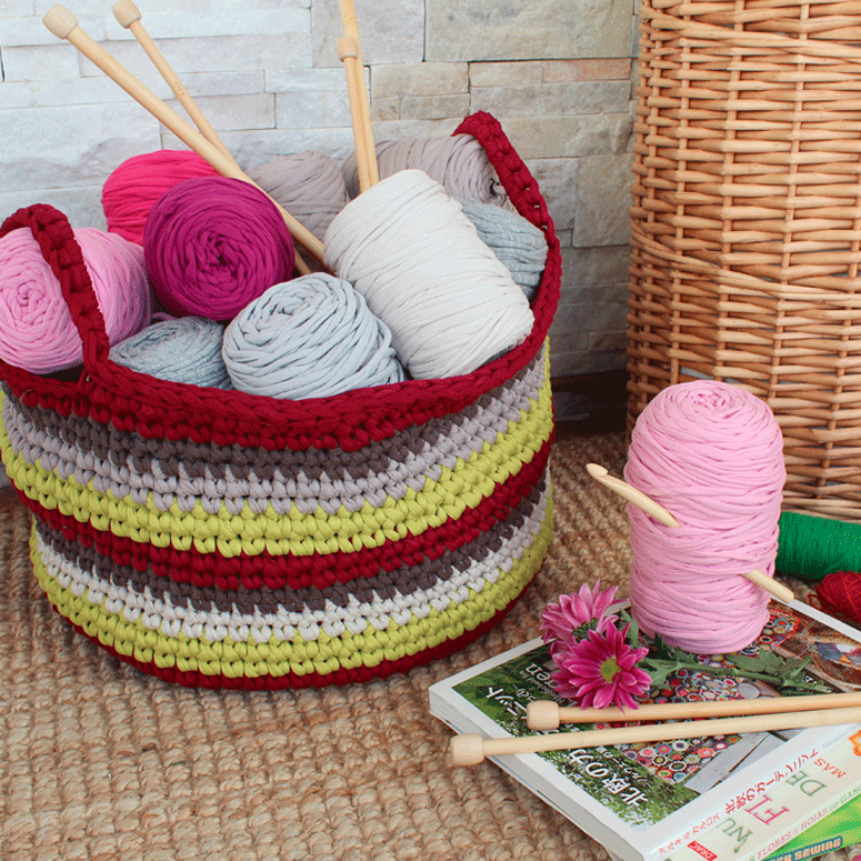 Dos tardes serán suficientes para hacer esta bonita cesta de trapillo para guardar tus labores. Es resistente, práctica y decorativa.