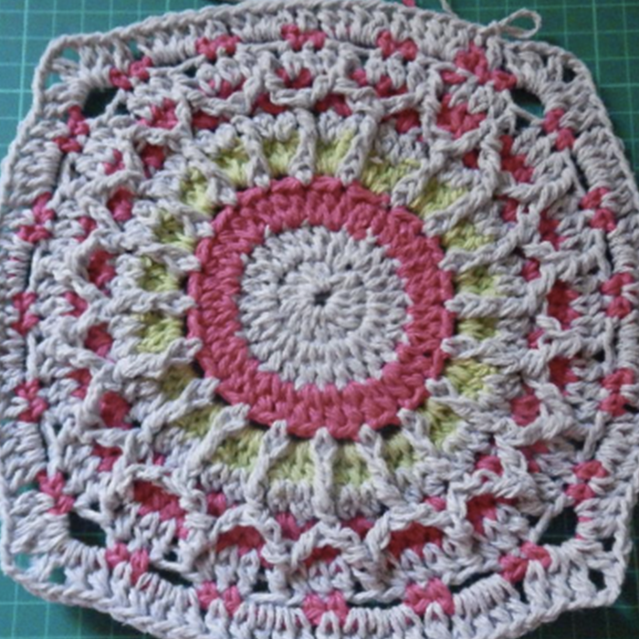 *Repetimos la secuencia de granny con los pt. relieve en el color gris, (total de filas 5). Vueltas 13-14