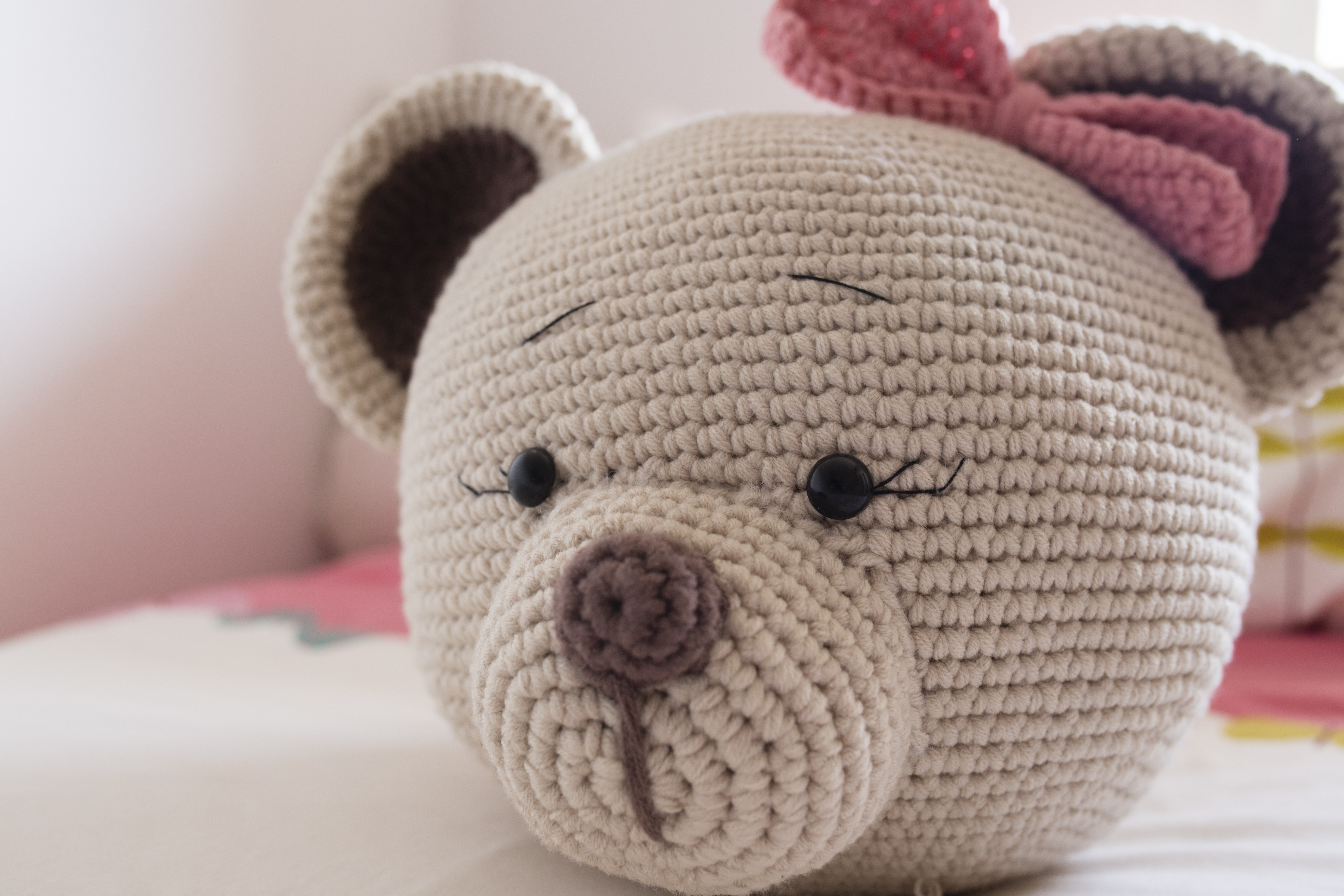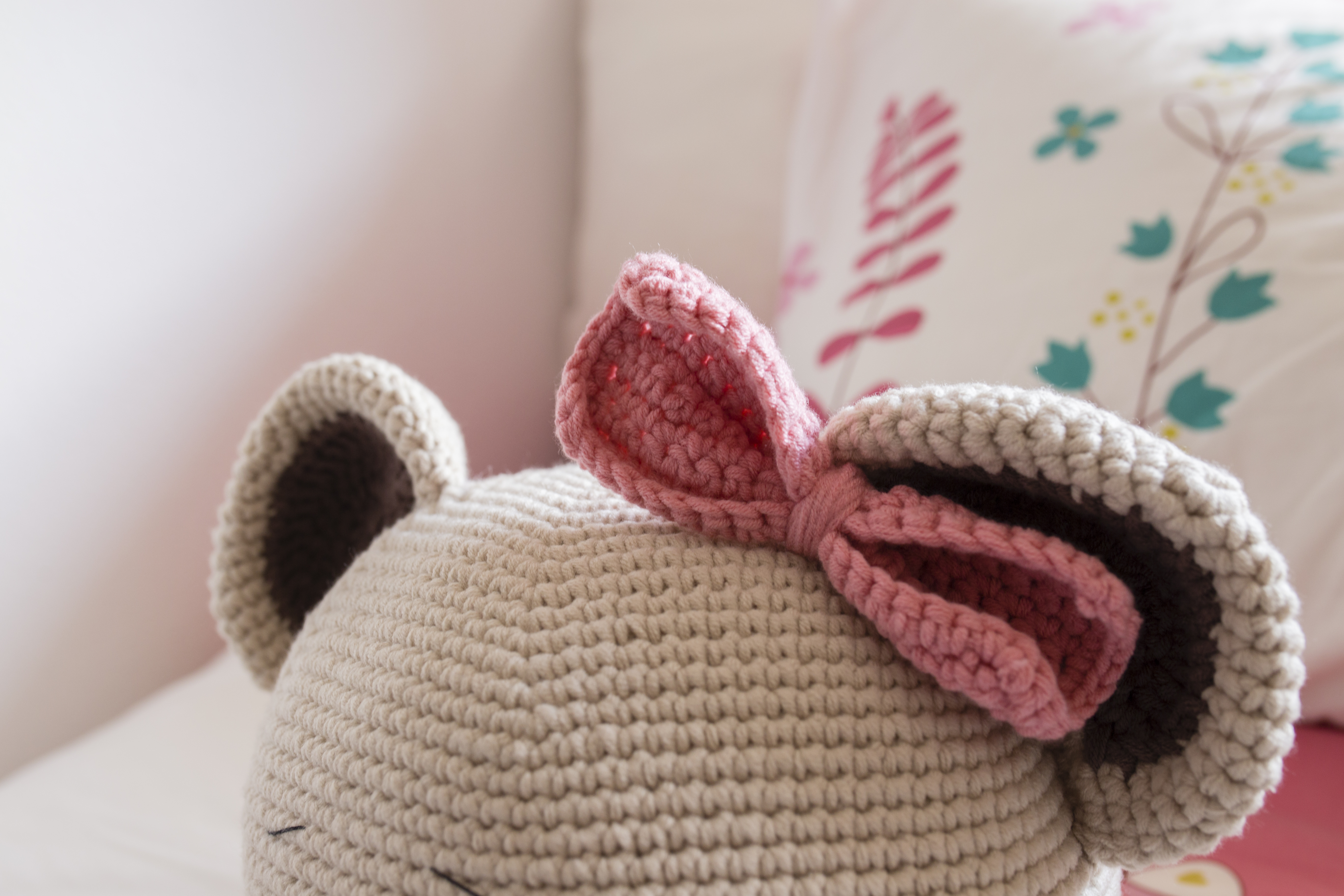 Tamaño: 75 cm perímetro y 25 cm alto INDICACIONES DEL PATRÓN NOTA: este patrón se teje en espiral, a no ser que se indique lo contrario señalando el primer punto con un marcador. ABREVIATURAS AM: ANILLO MAGICO PB: PUNTO BAJO PR: PUNTO RASO AUM: aumento DISM: disminución V: ES LA VUELTA EN LA QUE TE ENCUENTRAS TEJIENDO CABEZA: EN COLOR CRUDO Colocar los ojos de seguridad entre la V17 con 3 puntos de separación V1: Am de 6 pb = 6 V2: aum c/pto = 12 V3: pb, aum = 18 V4: 2pb, aum = 24 V5: 3pb, aum = 30 V6: 4pb, aum = 36 V7: 5pb, aum = 42 V8: 6pb, aum = 48 V9: 7pb, aum = 54 V10: 8pb, aum = 60 V11: 9pb, aum = 66 V12: 10pb, aum = 72 V13: 11 pb, aum= 78 V14: 12pb, aum = 84 V15: 13pb, aum = 90 V16: 14pb, aum = 96 V17: 15 pb, aum = 102 V18 A V 35: pb en cada pto = 102 V36: 15pb, dism = 96 V37:14 pb, dism = 90 V38: 13pb, dism = 84 V39: 12pb, dism = 78 V40: 11pb, dism = 72 V41: 10pb, dism = 66 V42: 9pb, dism = 60 V43: 8pb, dism = 54 V44: 7pb, dism = 48 V45: 6pb, dism = 42 V46: 5pb, dism = 36 V47: 4 pb, dism = 30 V48: 3pb, dism = 24 V49: 2pb, dism = 18 V50: 1pb, dism = 12 V51: dism en cada pto =6 V52: cierra todos los puntos con una aguja lanera. OREJAS: EN COLOR CRUDO Hacer dos iguales V1: Am de 6 pb = 6 V2: aum c/pto = 12 V3: pb, aum = 18 V4: 2pb, aum = 24 V5: 3pb, aum = 30 V6: 4pb, aum = 36 V7: 5pb, aum = 42 V8: 6pb, aum = 48 V9 a V12: pb en cada pto = 48 V13: 6pb, dism = 42 V14: pb en cada pto = 42 V15: 5pb, dism = 36 OREJAS PARTE INTERIOR EN COLOR MARRÓN OSCURO Hacer dos iguales V1: Am de 6 pb = 6, 1 cad, gira V2: aum c/pto = 12, 1 cad, gira V3: pb, aum = 18 Teje ahora 1 cadeneta y continúa tejiendo la parte de abajo para obtener un mejor acabado y teje 12 pb. Remata y deja un hilo largo para coser. HOCICO EN COLOR CRUDO V1: Am de 8 pb= 8 V2: aum en cada pto = 16 V3: pb, aum =24 V4: 2pb, aum = 32 V5: 3pb, aum = 40 V6 a V10: pb en cada pto = 40 NARIZ EN COLOR MARRÓN V1: Am de 8 pb= 8 V2:( aum, 3pb) x2 = 10 V3: (aum, 4pb) x2=12 LAZO EN COLOR ROSA Teje una cadeneta de 18 ptos + 1 de subida V1 a V11 pb en cada pto.= 18 Al acabar teje pb alrededor de la pieza para lograr un mejor acabado Para finalizar enrosca una hebra alrededor de la pieza dándole varias vueltas, de esta manera conseguirás darle la forma al lazo. MONTAJE Cose un lado con el otro de las orejas dejando una hebra larga para coser después a la cabeza, antes de ello cose la parte marrón centrándola en la oreja. Una vez cosidas las orejas a la cabeza, sitúa el lazo en el lado que más te guste de la cabeza. Borda una línea en el mismo color que la nariz para simular la boca y a continuación cose el hocico a la cara. Después cose la nariz justo encima de dónde has bordado la boca. Ya tienes tu cojín terminado, puedes ponerlo en la cama de los más pequeños, la elección de tu manera de colgarlo la dejo a tus posibilidades y a tu imaginación y creatividad.ACABADO