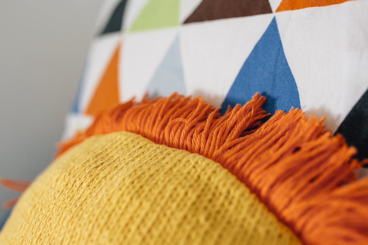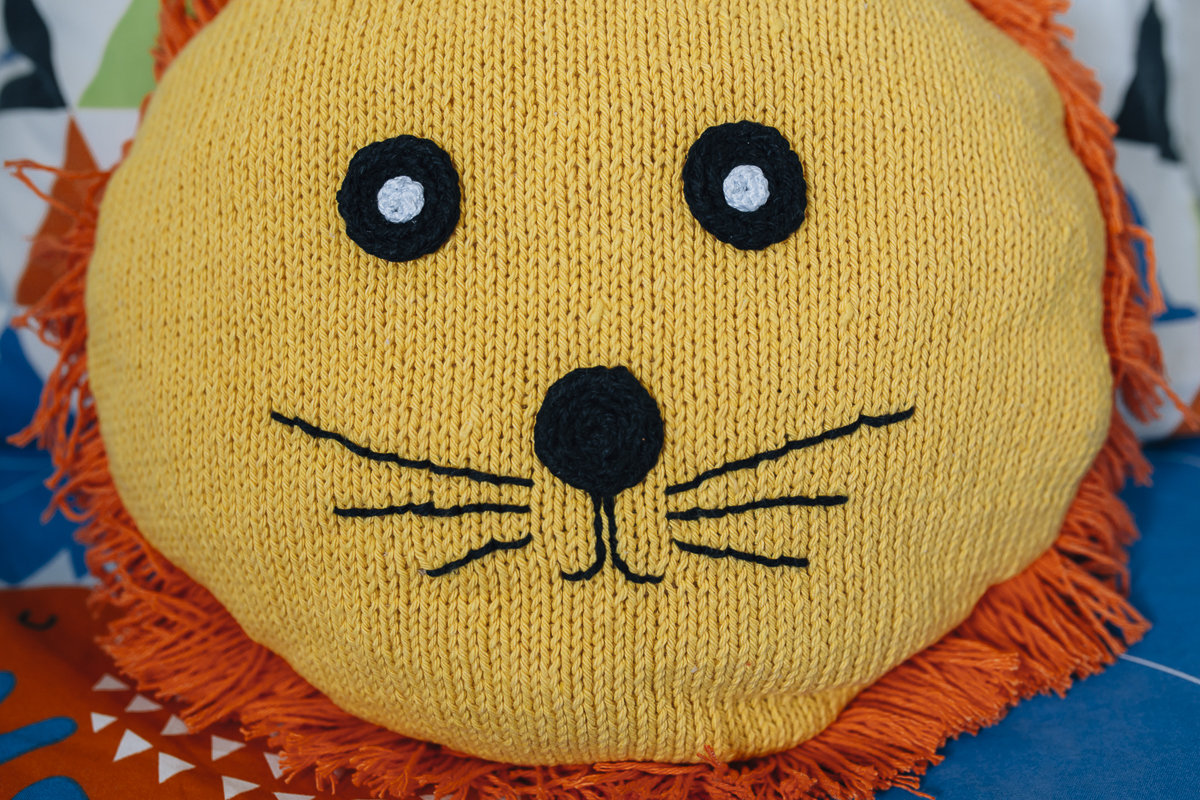 Con algodón rústico reciclado Caricia Nature de Sevimex y aguja de tricotar nº3,5, montar 76 p. a p. jersey derecho. Hacer un cuadro de 36x36 cm aproximadamente. Se plancha y se marca un redondel de 31 cm de diámetro. Tendremos que hacer 2 partes iguales. En la parte delantera, se cosen 3 círculos de crochet de 3 cm de diámetro. A 2 se le ponen un círculo pequeño blanco que serán los ojos. El último será la nariz (ver detalle en la foto de abajo) y con el color negro de Caricia Nature se hacen los bigotes del león. Para hacer el pelo, utilizaremos el color naranja de Caricia Nature. Haremos unos flecos pequeños para lo que cortaremos de Caricia Nature de 6 cm. Haremos grupos de 8 o 10 hilos y los vamos cosiendo al círculo que marcamos al principio (con los flecos para dentro). Cuando hayamos rellenado todo el borde del cojín león, cosemos la parte trasera, dejando un hueco para meter el relleno. Una vez relleno terminamos de coser.ACABADO
