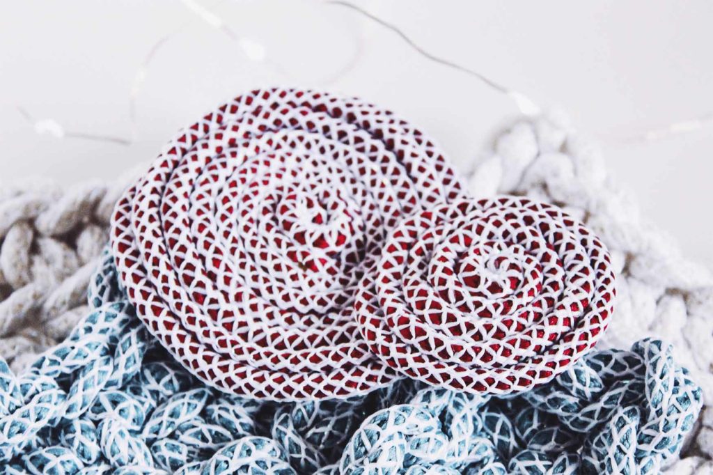 Para hacer las flores únicamente tenemos que enrollar en espiral un par de trocitos de Cordón, los cosemos por la parte de atrás para que no se deshagan.*Hojas
