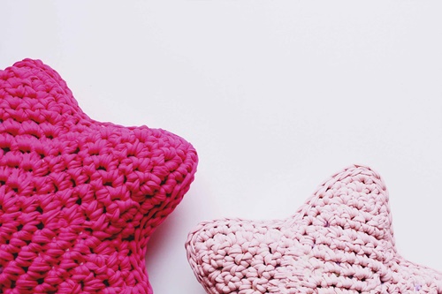 *Todo el patrón se hace a puntos bajos. La parte central del cojín se tejen en espiral, sin cerrar las vueltas y los picos se tejen uno a uno, de forma separada y girando la labor en cada vuelta. PARTE CENTRAL: v1. AnMag con 6pb v2. 6am (12p) v3. *1pb-1am* x6 (18p) v4. *2pb-1am* x6 (24p) v5. *3pb-1am* x6 (30p) PICOS: *Al terminar cada hilera hacemos una cadeneta y giramos para empezar la siguiente h1. Continuamos en el punto siguiente al último de la v5 y hacemos 7pb h2. 7pb h3. 5pb (nos saltamos el primer y el antepenúltimo punto) h4. 5pb h5. 3pb (nos saltamos el primer y el antepenúltimo punto) h6. 3pb h7. 1pb (nos saltamos los dos primeros puntos) Cortamos hebra y rematamos. Para hacer el siguiente pico, el primer punto bajo de los 7pb de la primera hilera le tejemos en el mismo punto donde hicimos el séptimo pb de la primera hilera del pico anterior. Repetimos el patrón hasta tener los 5 picos. REMATES: Hacemos 2 vueltas de pb al rededor de toda la estrella, haciendo 3pb en el último pb de cada pico. Una vez tengamos hechas las dos partes (delantera y trasera) unimos los bordes con pr dejando una pequeña apertura para rellenar, rellenamos y terminamos de cerrar.ACABADO FINAL: