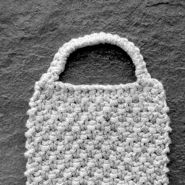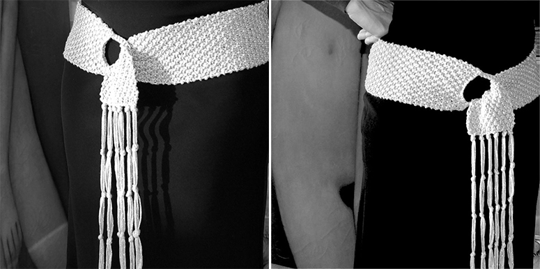 Con la hebra que hemos dejado al cerrar, rematar este lado del fajín a punto enano. A continuación realizar 14 cadenetas al aire, enganchar en el otro extremo y rellenar a p. bajo en toda su longitud. Apuntar.