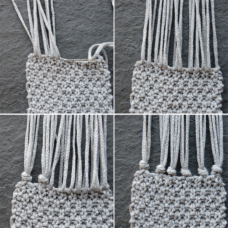 Para fijar los flecos, hacer un nudo en la base tomando cuatro hebras, obteniendo así 6 flecos. Realiza más nudos a lo largo de cada fleco dejando una distancia entre sí de 8 cm de largo.