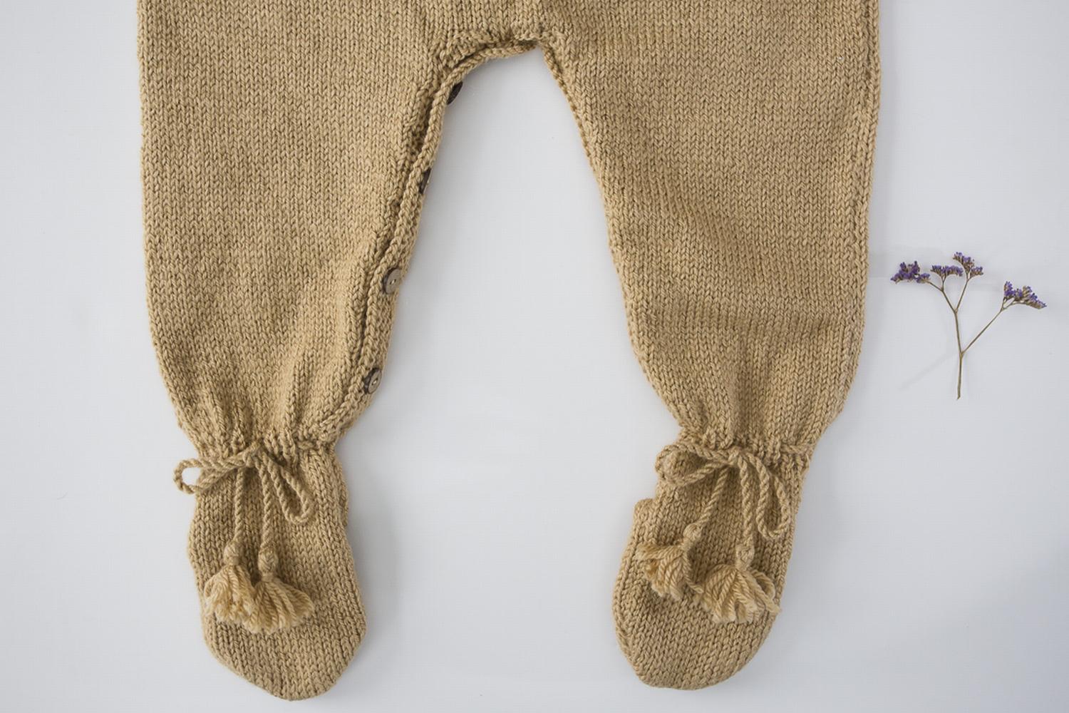 Se cosen los hombros y los costados hasta el pie (ya se explicó antes como se cose el pie para formar el talón). De la abertura de la espalda sacamos los p. necesarios para hacer las dos tiras, en una haremos los ojales. Las tiras son 6v. de p. bobo. Del hueco del cuello se sacan los p. para hacer 6v. de p. bobo. Se cose la manga y se coloca en el hueco. La tira de la entrepierna se hace sacando los p. de las dos piernas seguidas, primero la parte de delante y después la parte de detrás haciendo aquí los ojales. Hacer 2 cordones de 6 cabos con 1 borla en cada extremo. Se mete por el elástico del tobillo y se hace una lazada para que el pie no se salga. Se cosen los botones