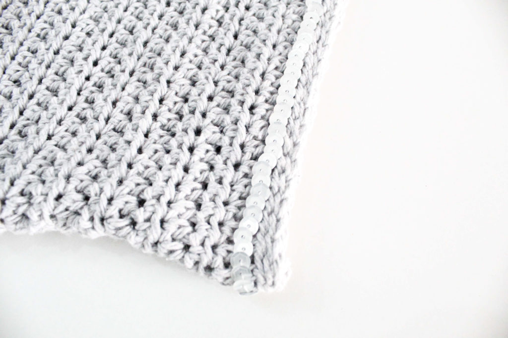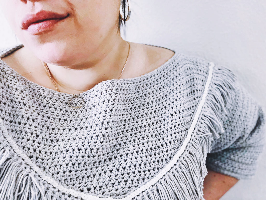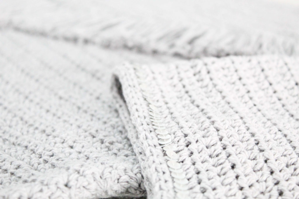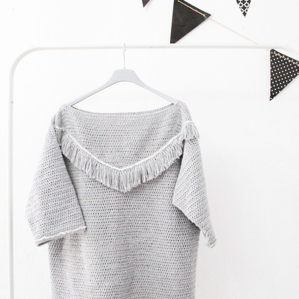 Para rematar el sweater haz una vuelta de pr sobre el hueco del cuello y al final de las mangas, además, yo le añadí una tira de flecos en el pecho en forma de V que le da un toque chulísimo. Para hacer esta tira, tan solo tienes que hacer una cadeneta de los cm que corresponda, y rellenarla de puntos medios. A estos puntos les unes pequeñas borlas que formarán los flecos. Para terminar de darle el toque especial, puedes coser una tira de lentejuelas satinadas a lo largo de los flecos y en el filo de las mangas, igual que la autora de este fantástico sweater.ACABADO FINAL