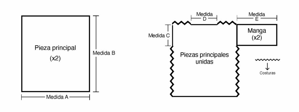 Para ponerte un poco en situación, vamos hacer dos piezas principales, un delantero y un trasero. Las uniremos por los costados y el cuello (dejando hueco de mangas y escote) y tejeremos después las mangas. Tal que así:ABREVIATURAS