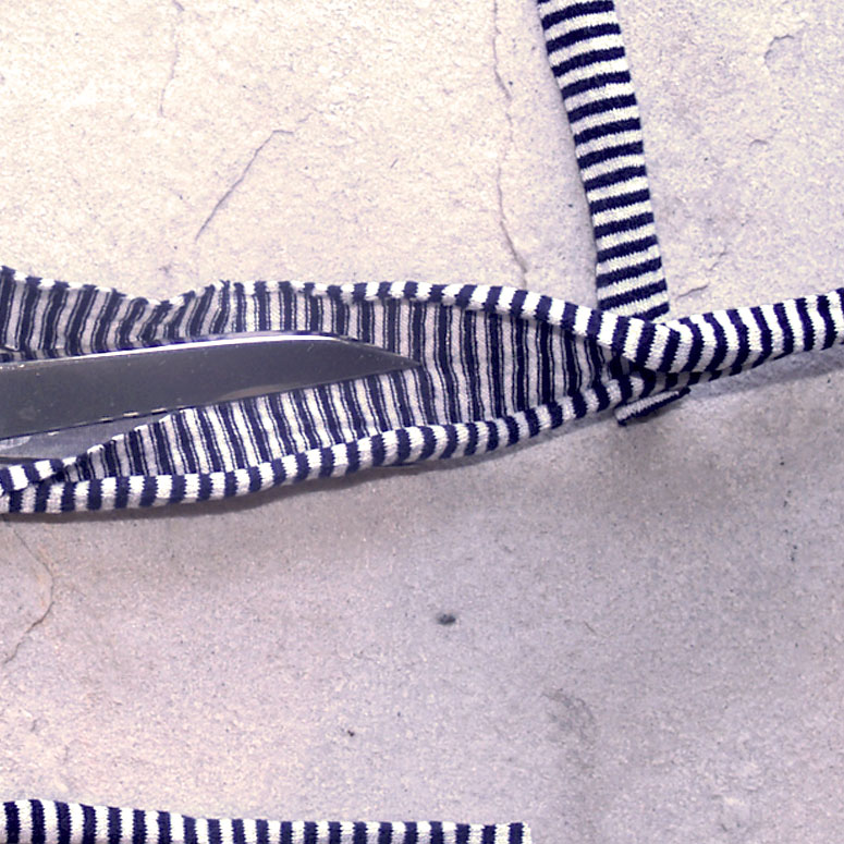 Antes de llegar al final, deja un trocito (unos 6 cm) sin cortar. Dobla ese trozo y con aguja e hilo que contraste con tu trapillo, apúntalo y realiza varias pasadas alrededor del trapillo, formando así la presilla.