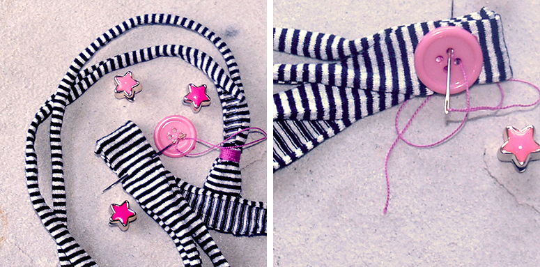 A continuación introduce el abalorio o cose el botón a lo largo de las distintos extremos del trapillo, donde más te guste!