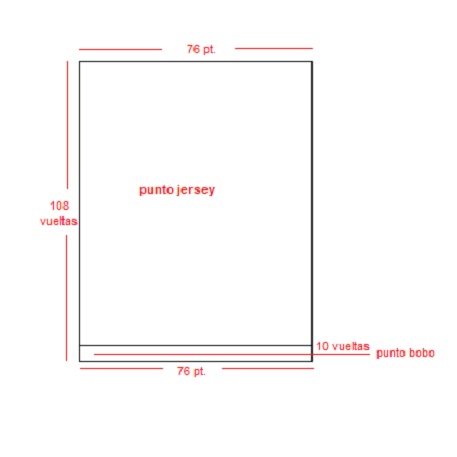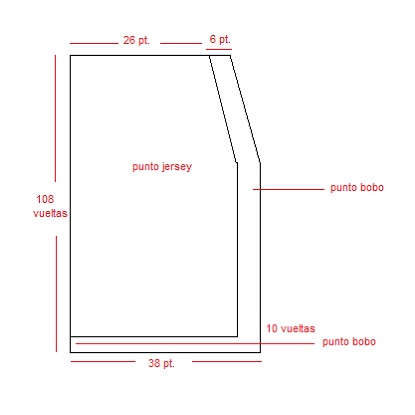 ⦁ Montar 38 puntos. ⦁ Tejemos en punto bobo un total de 10 vueltas. ⦁ Comenzamos el punto jersey antes de finalizar la vuelta haremos el borde con 6 puntos de punto bobo, haciendo un total de 70 vueltas. (Toma en cuenta que tienes de hacer una pieza con borde a la derecha y la otra pieza con borde a la izquierda) ⦁ Haremos unas series de disminuciones cada 6 vueltas impares, en lo que estemos haciendo el punto bobo del borde, en el punto 6 comer un punto jersey, tendrás un total de 11 disminuciones. ⦁ El total de vueltas 108. ⦁ Cerrar los puntos lo que te debería quedar un total de 26.