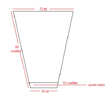 ⦁ Montar 36 puntos. ⦁ Tejemos punto bobo un total de 10 vueltas. ⦁ Comenzamos el punto jersey y hacemos 22 vueltas. ⦁ Siguiente vuelta aumento esto se realizara cada 6 vueltas. ⦁ Tendrás un total de 93 vueltas, cerrar los puntos. ⦁ Al finalizar debes tener un total de 54 puntos.