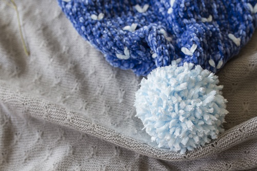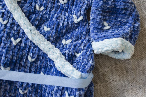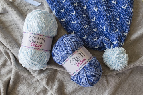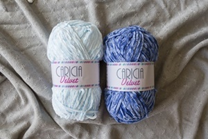 Lana Caricia Velvet color 011 (1 ovillo) y 016 (3 ovillos)- Cinta algodón 1,50 m 1 botón Hilo azul y aguja de coser Aguja de tricotar nº 5 Aguja lanera Material para hacer un pompón Puedes adquirir los materiales a través de los enlaces a nuestra tienda online que aparecen arriba en el listado.