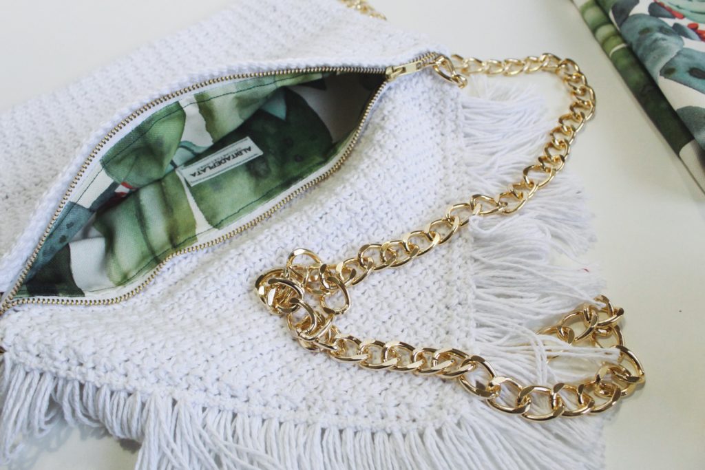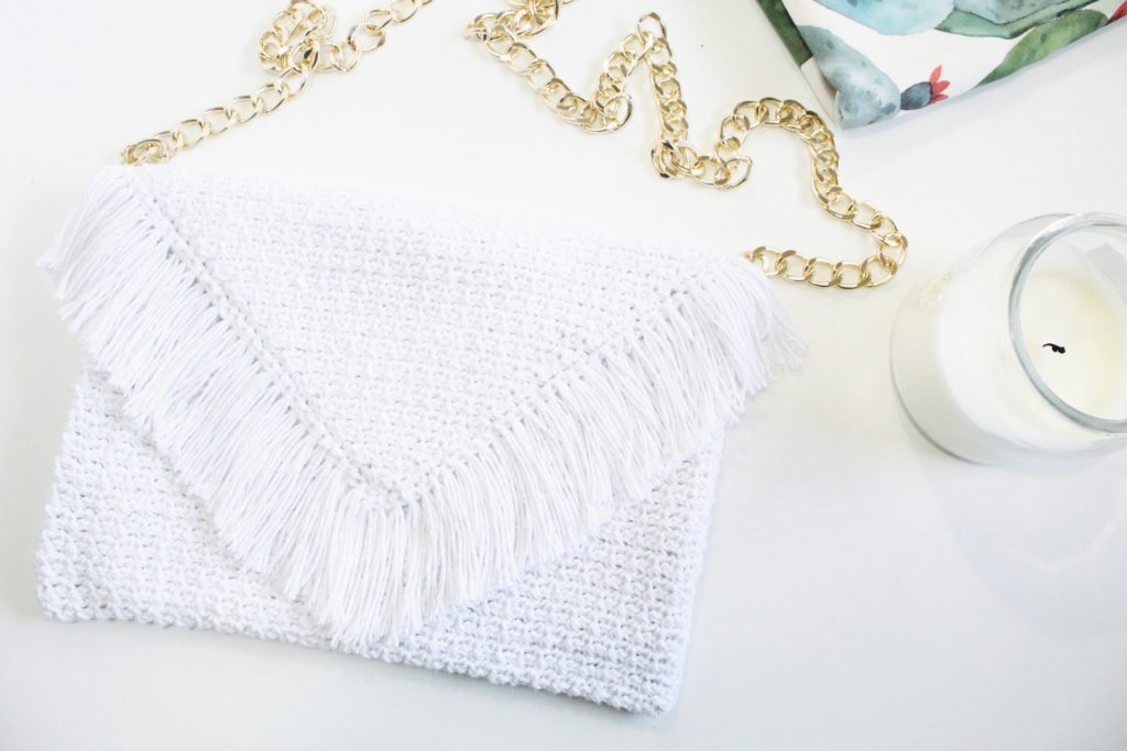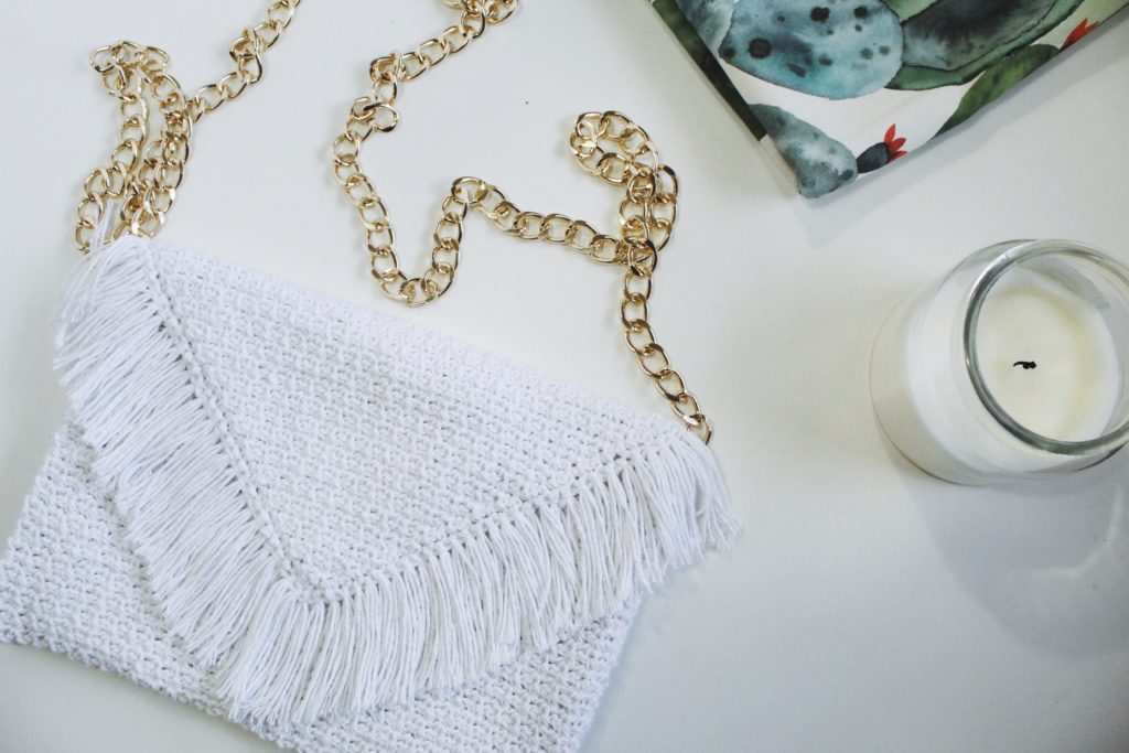*En este patrón vamos a aprender a hacer un punto nuevo, al que he denominado ‘punto brick’, que es tan sencillo como hacer un número impar de cadenetas de inicio e ir alternando un punto bajo y una cadeneta a lo largo de toda la hilera. Siempre con una cadeneta para comenzar cada vuelta y, siempre, los puntos bajos encima de los puntos bajos de la vuelta anterior. Te dejo por aquí arriba un gráfico de muestra para que lo veas más sencillo. Comienzo: Hacemos una cadena con 59ca y una ca de subida. V1: *1pb-1ca (saltar 1ca abajo)* Repetir toda la hilera. Continuamos con pbk a lo largo de 80 vueltas. Empezamos las disminuciones (img.1): V81: saltamos el 1er pb y la 1ca de la vuelta y hacemos la hilera normalmente. Repetimos a lo largo de 28v más hasta que nos quedemos con una vuelta de un solo pb. Nos quedará una pieza tal que así (img.2): Hacemos una vuelta completa a todo el contorno haciendo puntos bajos. Doblamos a la mitad la parte recta, de tal manera que quede con forma de sobre y cosemos los laterales (img.3 ). Yo los he unido con punto raso, pero puedes hacerlo con aguja lanera, como prefieras. En la solapa, he puesto flecos haciendo pequeñas borlas a lo largo de todo el borde. Puedes poner un forro con cremallera y coserle la cadena a este, para que no cree tensión en la pieza de ganchillo.ACABADO FINAL